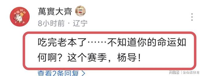 俱乐部杯赛早早出局,也令许多辽迷也感到非常失望,“吃完老本了……不知道你的命运如何啊?这个赛季,杨导!”;“感觉至少5年内辽宁是没希望了”;“他就是cba的泰伦卢”;“你现在的首要任务是下去给乌戈当助理”;“还扯蛋呢,继续洗,睁着眼说瞎话”;“这哪是阵痛期,我都看不到希望,这是职业球队的运营么?有年轻球员储备么?全靠吉林输血?这批老将一下去新生代一个能打的都没有,呵呵”……